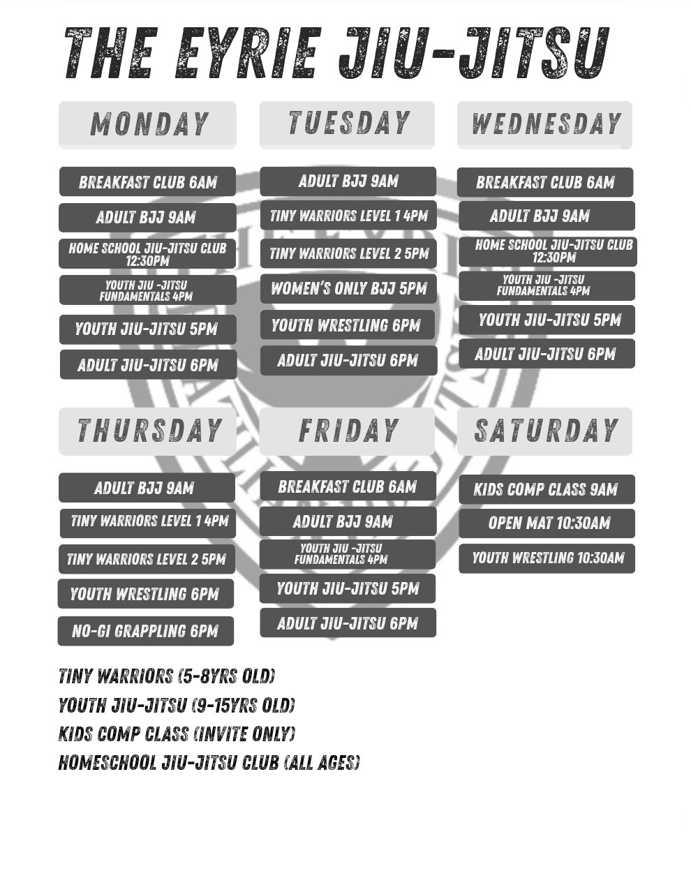The Eyrie Jiu-Jitsu offers classes that cater to all ages and levels of physical fitness. Whether you are looking to get in shape, practice as a hobby, or test yourself through competition, The Eyrie Brazilian Jiu-Jitsu offers classes to fit your needs.